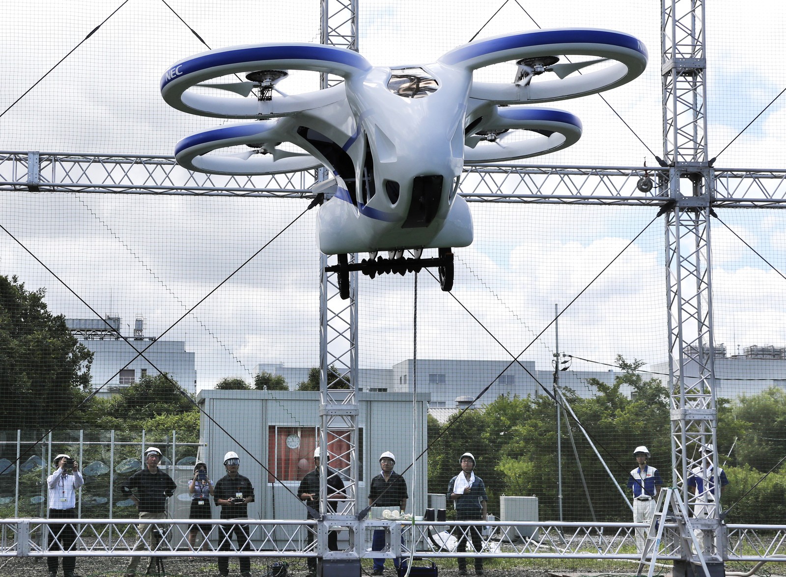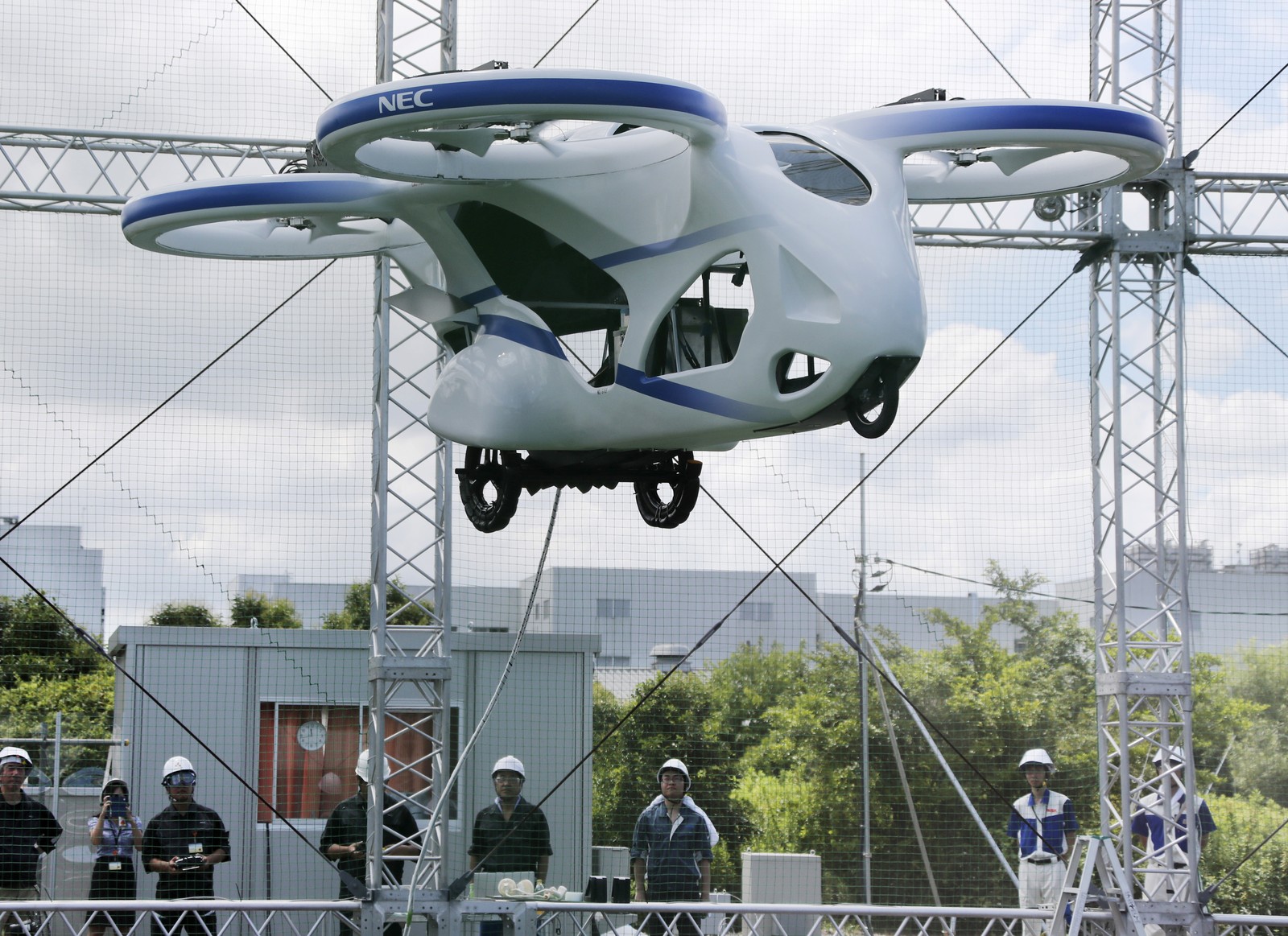 A corrida para tornar o carro voador realidade está a todo vapor. No Japão, a Nec Corp realizou nesta segunda-feira (5) um teste para seu protótipo. Dentro de uma grande gaiola de segurança, o veículo levantou a 3 metros de altura e ficou voando por cerca de um minuto.